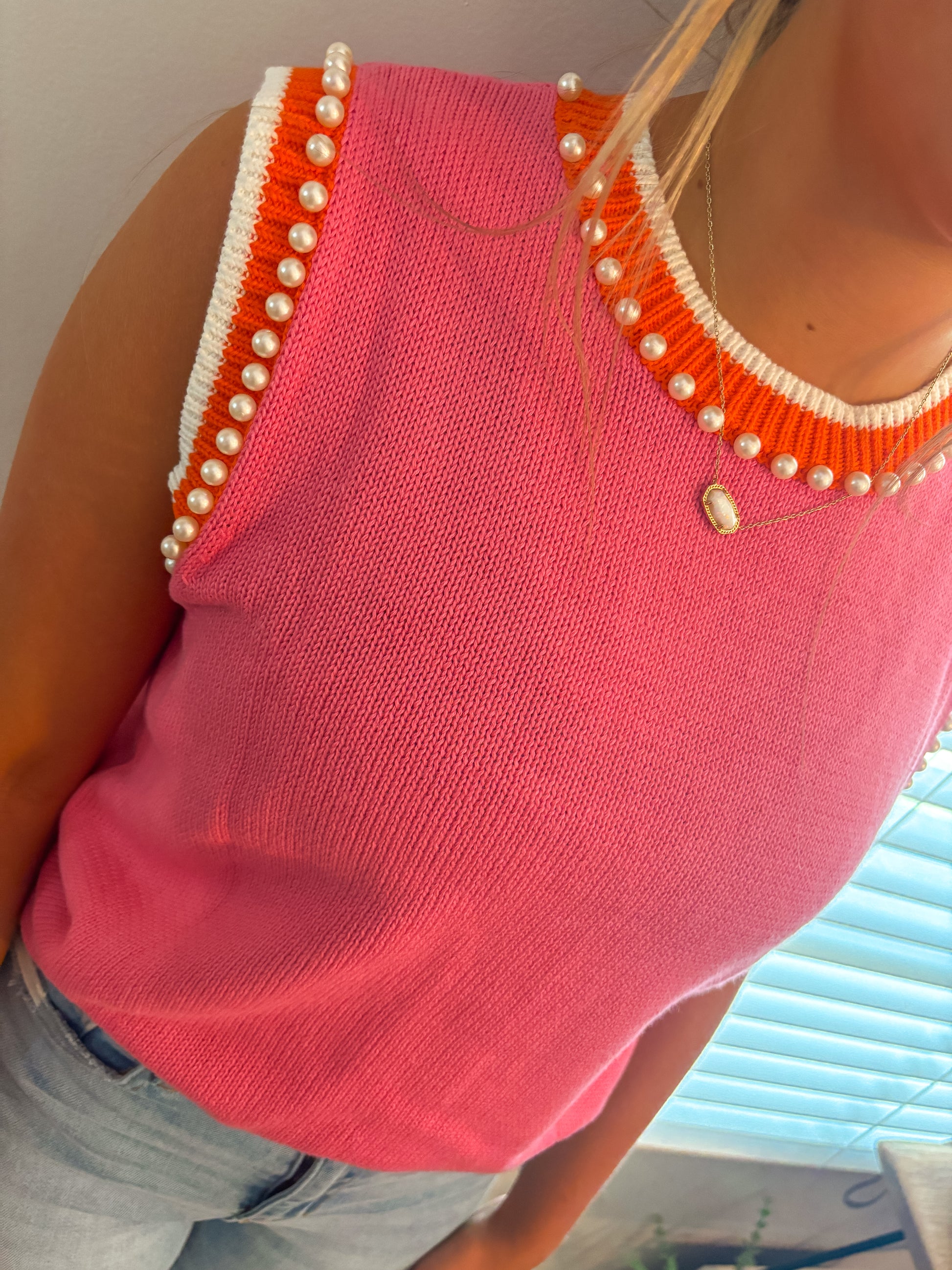 Add a pop of preppy charm to your wardrobe with this bold and playful knit tank. Featuring a bubblegum pink base trimmed with vibrant orange and white, this top is perfectly accented with dainty pearls along the neckline and sleeves for that girly, polished touch. The sleeveless cut makes it breezy for summer but easy to layer into fall. Whether you’re headed to brunch or class, this top is made to stand out